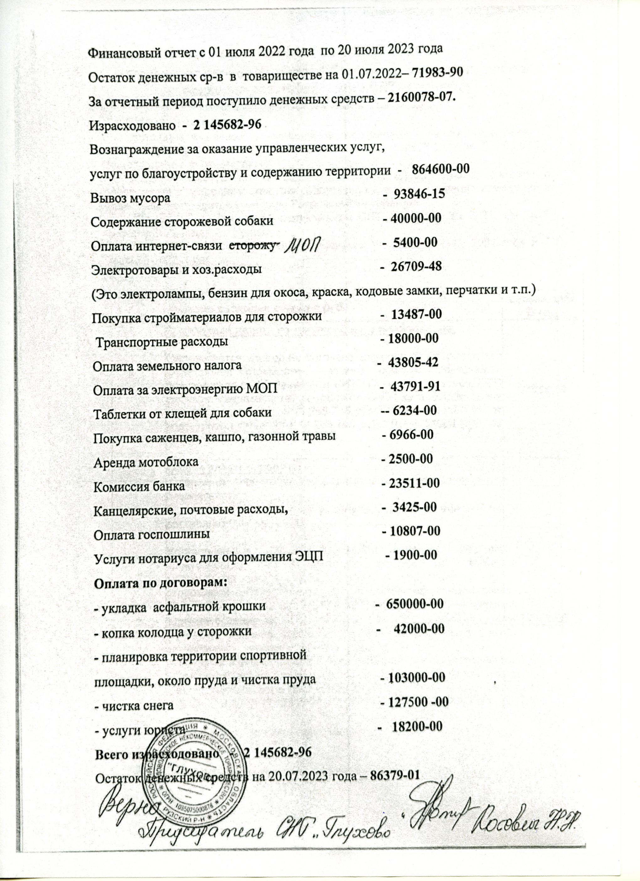 В этом отчёте Истец СНТ «Глухово» Котович Н.Н. не предоставила Суду доказательные документы, подтверждающие финансовые расходы.
