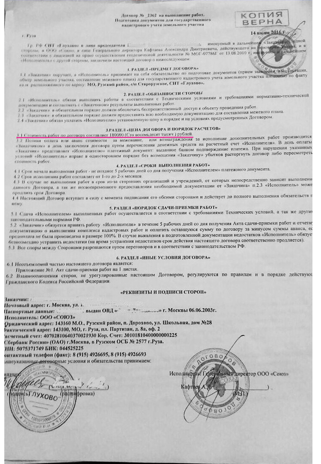 Стоимость работ по договору составляет 180000 руб.
