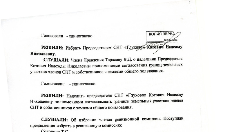 РЕШИЛИ: Наделить председателя СНТ «Глухово» Котович Надежду Николаевну