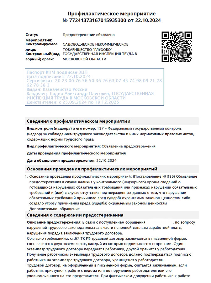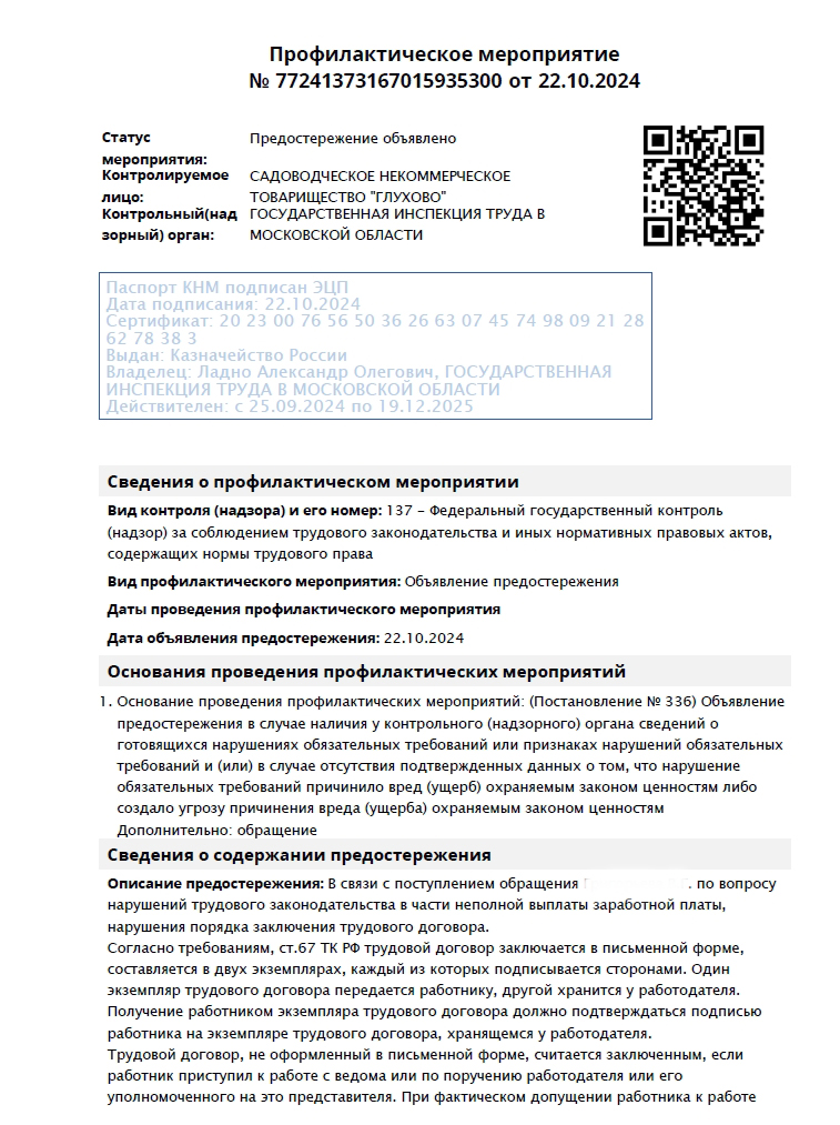 В октябре 2024г. Государственная инспекция труда МО объявила предостережение СНТ "Глухово". Председателю СНТ "Глухово" Котович Надежде Николаевне необходимо заключать договора с работниками и проводить оплату их труда!!! (Устав Ст. 19.5 принимает на работу в товарищество работников по трудовым договорам, осуществляет права и исполняет обязанности товарищества как работодателя по этим договорам;)